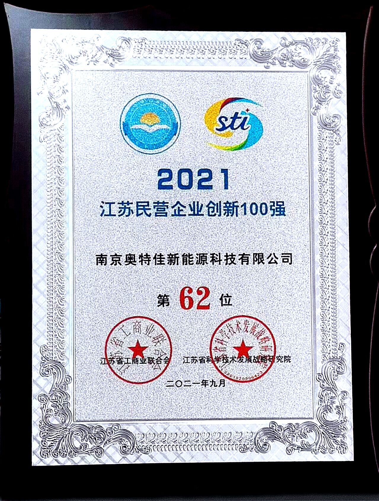 南京奥特佳喜获 “2021年江苏民营企业创新100强”荣誉称号