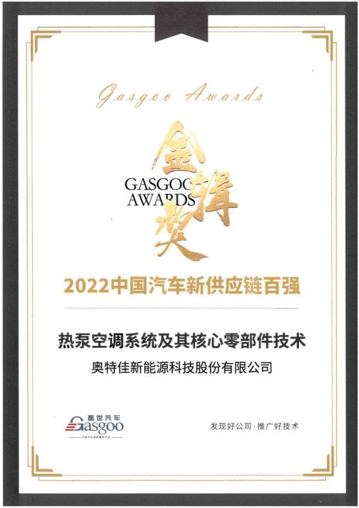 奥特佳喜获“金辑奖2022中国汽车新供应链百强”荣誉称号